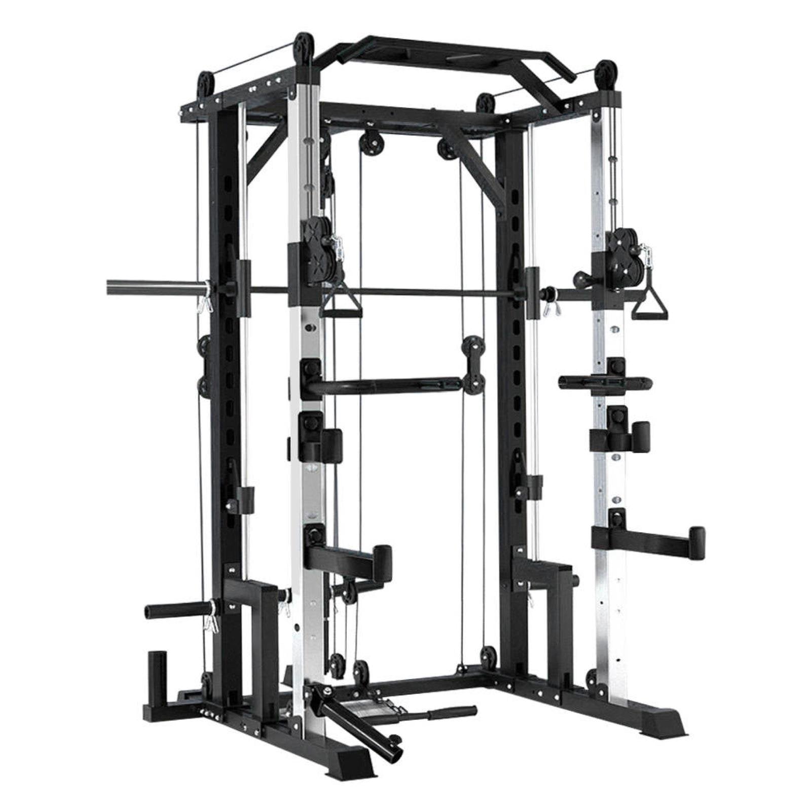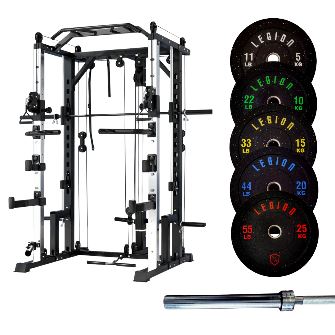 The Legion Fitness Equipment V2 Multi-Gym with Smith Machine is a must have piece of training equipment. Features include Height Adjustable Dual Cable System, Ground Level Single Cable, Landmine with Row Attachment, Smith Machine, Dual Plate Storage Racks, Barbell Storage and a Multi Grip Chin Up Bar.