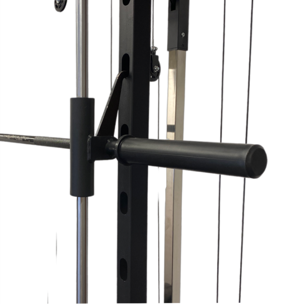The V2 Multi Gym with Smith Machine also comes with multiple Cable & Non Cable Attachments: Lat Pulldown Bar, Flat Short Bar, Tricep Dip Pair, J Hooks, Spotter Arms, Cable Handles, Land Mine and Barbell Row Handle.