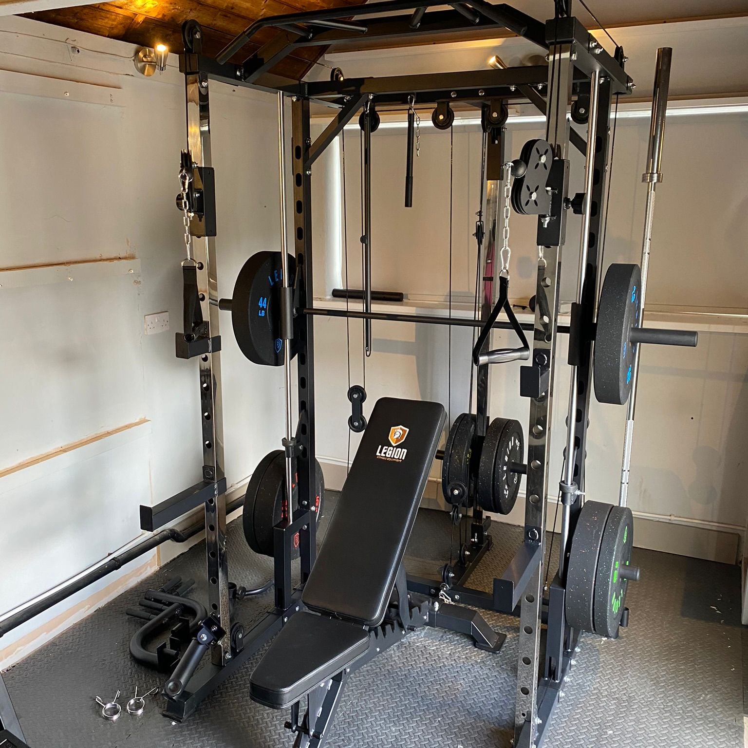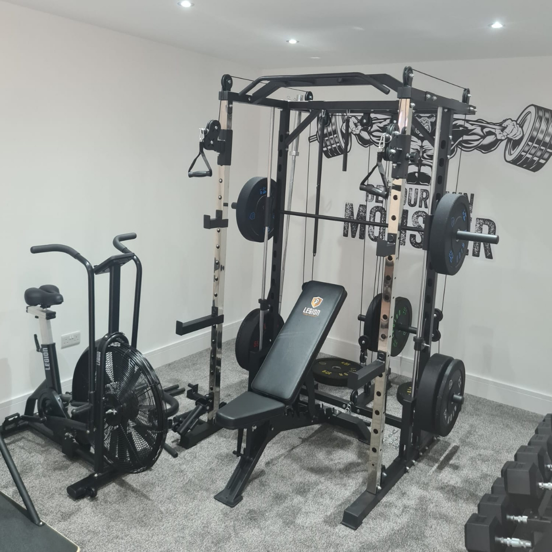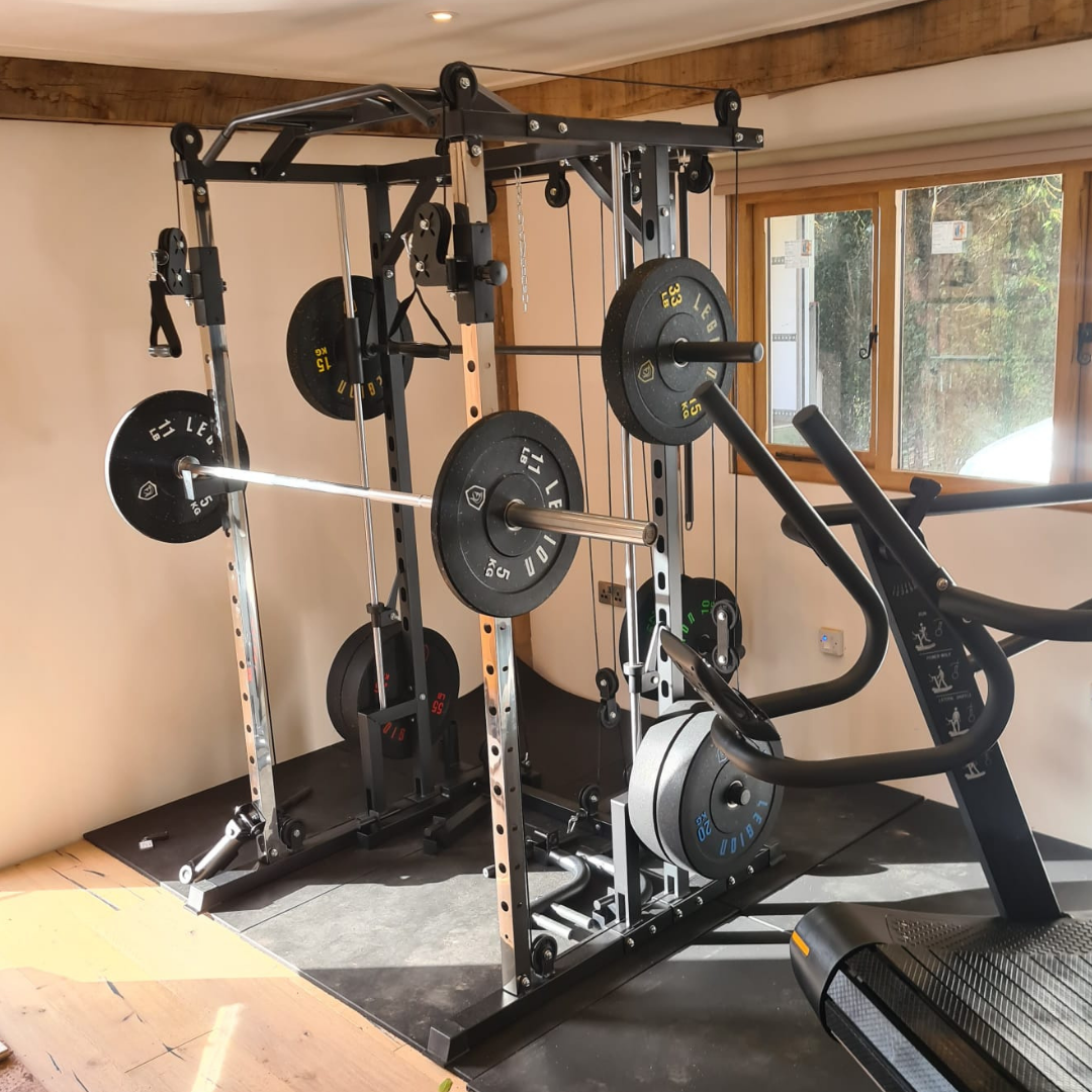 The Legion Fitness Equipment V2 Multi-Gym with Smith Machine is a must have piece of training equipment. Features include Height Adjustable Dual Cable System, Ground Level Single Cable, Landmine with Row Attachment, Smith Machine, Dual Plate Storage Racks, Barbell Storage and a Multi Grip Chin Up Bar.