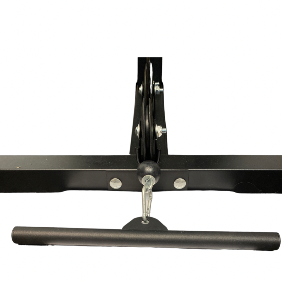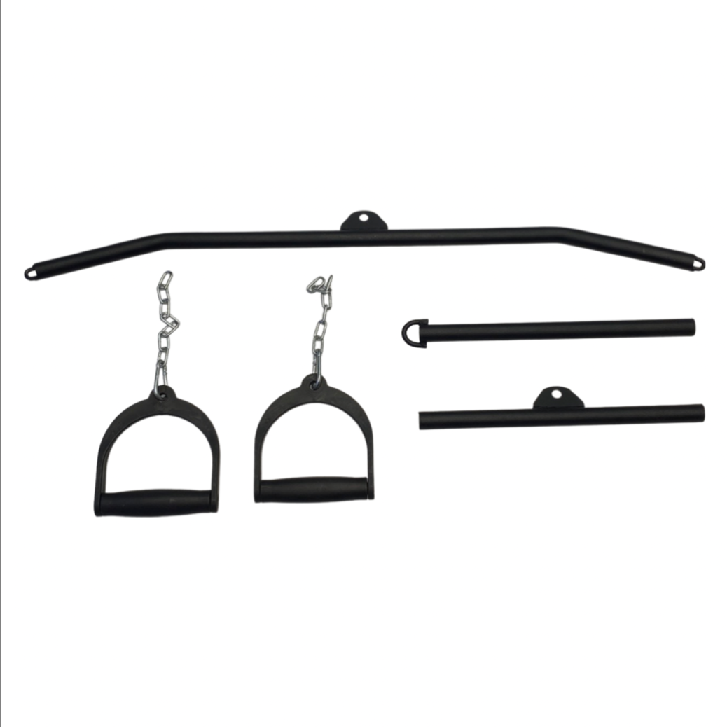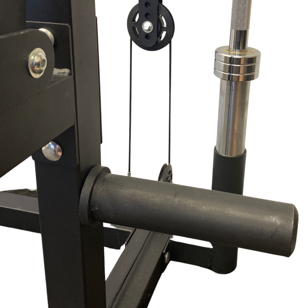 The V2 Multi Gym with Smith Machine also comes with multiple Cable & Non Cable Attachments: Lat Pulldown Bar, Flat Short Bar, Tricep Dip Pair, J Hooks, Spotter Arms, Cable Handles, Land Mine and Barbell Row Handle.