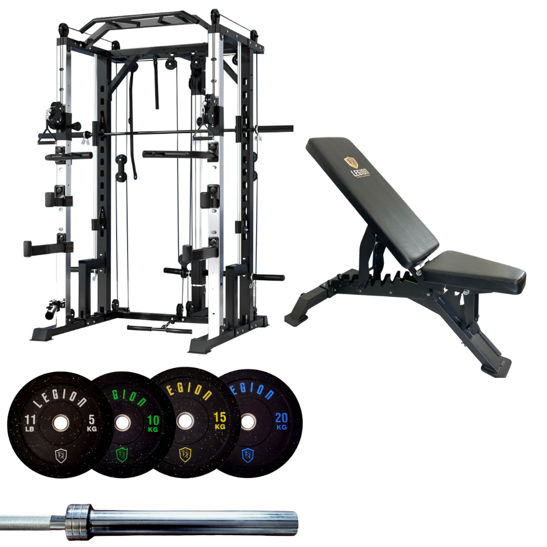 The Legion Fitness Equipment V2 Multi-Gym with Smith Machine is a must have piece of training equipment. Features include Height Adjustable Dual Cable System, Ground Level Single Cable, Landmine with Row Attachment, Smith Machine, Dual Plate Storage Racks, Barbell Storage and a Multi Grip Pull Up Bar.
